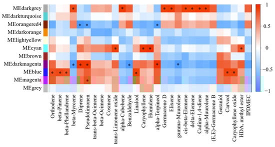 Apart from the above findings, weighted gene co-expression network analysis (WGCNA) was performed on transcriptomic results and all the detected volatiles. As shown in Figure 5, monoterpenoids orthodene, beta-pinene, beta-phellandrene, linalool and carveol were correlated to Blue Module. Darkgrey Module showed correlations with sesquiterpenes, including alpha-cubebene, germacrene D, elemenes and alpha-muurolene while Orangered4 Module was negatively correlated to monoterpenoids, including diprene, pseudolimonen and alpha-terpineol. Diversely, pseudolimonen was positively correlated to Magenta and Darkmagenta Modules, meanwhile, diprene and alpha-terpineol were correlated to Darkmagenta Module, which also exhibited negative correlation with beta-myrcene and gamma-muurolene. Trans-limonene oxide, caryophyllene and humulene performed similarly to Cyan Module. The uniquely detected benzaldehyde also showed negative correlation with Darkmagenta Module. Besides, HDA, methyl ester held positive correlation value with Cyan Module. Then, TFs enrichments were conducted in each module for discussion (Table S4).