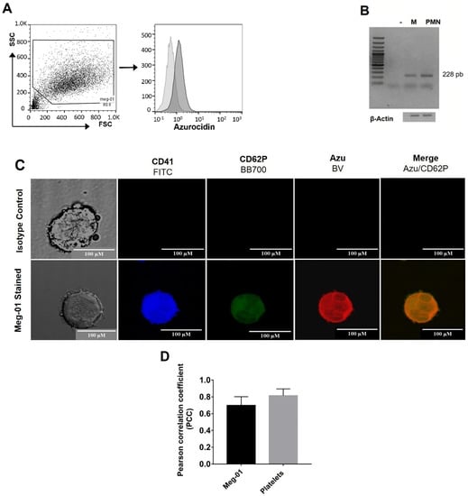 Meg−01 cells express azurocidin. (A) Intracellular staining for azurocidin was performed in the Meg-01 cell line using a specific mAb and analyzed by flow cytometry. In the figure, it is depicted in a dark gray histogram, while the light gray histogram indicates staining with the isotype control mAb. (B) Total RNA from Meg-01 cell cultures was extracted and analyzed for azurocidin expression by RT-PCR, amplicons of the expected size (228 bp) from cell line (M) and peripheral blood polymorphonuclear leukocytes (PMN) were resolved on 2% agarose gels, β−actin expression was used as housekeeping control. Both (A,B) data are representative of five independent experiments. (C) Confocal microscopy of Meg-01 cells, stained intracellularly with mAbs against CD41 (blue), CD62P (green), and azurocidin (red). Scale bar equals 100 µm (representative images of 3 independent assays). (D) The graphs show the averages ± SD of the Pearson correlation coefficient (PCC) value obtained for each image after background correction in the Regions of Interest (ROI) in five selected areas per slice of the co-localization visualized between CD62P and Azurocidin from 3 independent assays and analyzed with the Coloc-2 co-localization plug-in of FIJI.
