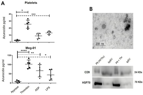 On the other hand, platelets are known to be one of the primary sources of EVs in blood [,], and the presence of azurocidin in pEVs has been reported in proteomic analyses []. Therefore, we decided to test this finding by purifying pEVs derived from thrombin treatment (tpEVs) or basal conditions (bpEVs) for 30 min. Figure 3B (top) shows a micrograph obtained by transmission electron microscopy (TEM) of the pEVs obtained and the characteristic CD9 and HSP90 markers of EVs (Figure 3B, bottom). The proteins obtained from the pEVs were used to determine the presence of azurocidin by ELISA. The results show that bpEVs and tpEVs contain similar azurocidin concentrations (32.8 ± 10.5 pg/mL vs. 28.5 ± 13.4 pg/mL) (Figure 3C), demonstrating that platelets release azurocidin-containing EVs under both basal and thrombin-activated conditions.
