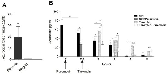 Platelets translate azurocidin. (A) Total RNA from Meg-01 cell line and peripheral blood platelets was extracted to quantify azurocidin expression by qRT-PCR. Graphs show the average expression values, calculated using the 2−ΔΔCt method and normalized for β-actin expression. Data are representative of three independent experiments. (B) 50 × 106 washed platelets from peripheral blood were treated with puromycin, and 0.5 h later received thrombin stimulation (the arrow indicates the time at which the treatments were added). Platelets were not stimulated with thrombin in the control condition, as indicated in the figure. Subsequently, we obtained total protein (cell and supernatant) at different times and quantified the amount of azurocidin by ELISA. In the figure, the graphs represent the mean ± standard deviation of 3 (A) or 4 (B) independent experiments. Statistical significance was determined by Dunn Sidak multiple comparison test (A) and 2-way ANOVA with repeated measures (B) and is represented as * p < 0.05, ** p < 0.01.