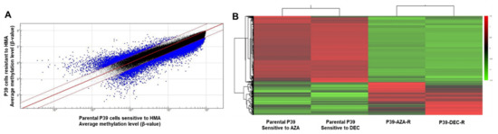 Differential methylation signature between hypomethylating agent (HMA)-resistant and sensitive P39 cells. (A) Scatter plot of differential methylation loci of hypomethylating agent-resistant and sensitive P39 cell lines. Average methylation levels of P39 cell line resistant to azacitidine and decitabine were compared with the mean methylation levels of P39 cells sensitive to azacitidine and decitabine. Differential methylation levels of at least 2.5-fold or 0.4-fold were included for downstream study as differentially methylated regions (DMRs); (B) Differential methylation signature and functional prediction of differentially methylated regions (DMRs) in HMA-sensitive and HMA-resistant cells. Hierarchical clustering of DMRs showed a global hypomethylation signature during resistance to both azacitidine (AZA) and decitabine (DEC). Methylation in AZA-resistant P39 cell line (P39-AZA-R) and DEC-resistant P39 cell line (P39-DEC-R) differed by a small number of hypermethylated genes. The sensitive parental P39 cells were treated separately with AZA and DEC at 1 µM for 48 h followed by immediate harvest for the assessment of methylation signature.