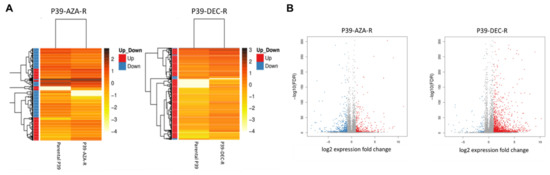 Differential expression profile of hypomethylating agent (HMA)-resistant P39 cells. (A) RNA expression profiles of AZA-resistant P39 (P39-AZA-R) and DEC-resistant P39 (P39-DEC-R) were distinct from each other with different clustering pattern; (B) Volcano plot of differentially expressed genes. Overexpression of genes was seen in P39-DEC-R and P39-AZA-R when compared with P39. The upregulated genes (blue) correspond to their negative log10 false discovery ratio (FDR) (p-value). P39-DEC-R (right) detected 1296 significantly upregulated genes (red dots) while P39-AZA-R (left) detected 306 significantly upregulated genes when compared with P39. There were 420 downregulated genes detected in P39-AZA-R and 89 downregulated genes detected in P39-DEC-R in comparison with P39.