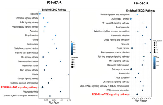 KEGG prediction for pathway and functional roles of differentially expressed genes (DEGs). Functional prediction by KEGG analysis of differentially expressed genes in hypomethylating agent (HMA)-resistant P39 sublines compared with P39 was performed separately for azacitidine-resistant P39 (P39-AZA-R) and decitabine-resistant P39 (P39-DEC-R). This gene set analysis studied both over-expressed and under-expressed genes together to look for biological pathways that are implicated. Both HMA-resistant sublines had dysregulated PI3K/Akt signaling that were predicted to be mediated by platelet-derived growth factor subunit A (PDGFA) and Endothelia PAS domain-containing protein 1 (EPAS1) upon correlation with DNA methylation patterns. Both sublines also showed similar dysregulation in cellular processes. The PI3K-Akt signaling pathway (red) was functionally significant in both cell lines. The results from this RNA expression-based analysis support the 850 K methylome data that predicted PI3K (PTEN and MDM2) signaling dysregulation during HMA resistance. Rich factor: ratio of the DEG number and the number of genes annotated in the relevant pathway. The greater of the Rich factor, the greater the degree of significance of the pathway identified. KEGG: Kyoto Encyclopedia of Genes and Genomes.