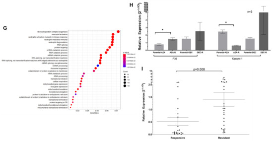 Association of PTEN and MDM2 methylation with mRNA expression. (A) Downregulation of PTEN by quantitative polymerase chain reaction (Q-PCR) in azacitidine and decitabine resistant cell lines; (B) Validation of PTEN DNA methylation in patients responsive or resistant to hypomethylating agents using pyrosequencing. Individual CpG methylation levels were displayed as individual data points with red data points (red dots) being the same loci (cg10041390) detected to be hypermethylated in 850k whole methylome microarray. The total number of dots denotes the number of CpG sites evaluated, where red dots d enote CpG sites with methylation changes and black dots denote flanking or additional CpG sites; (C) Downregulation of PTEN by Q-PCR in patients with myelodysplastic resistant to hypomethylating agents; (D) Expression of MDM2 in cell lines sensitive and resistant to azacitidine and decitabine; (E) Validation of MDM2 hypomethylation in patients with MDS resistant to hypomethylating agents by pyrosequencing. Individual CpG methylation levels were displayed as individual data points, with red data points (red dots) being the same loci (cg00614420) detected to be hypomethylated in 850k whole methylome microarray. The total number of dots denotes the number of CpG sites evaluated, where red dots denote CpG sites with methylation changes and black dots denote flanking or additional CpG sites; (F) Expression of MDM2 in patients with MDS responsive and resistant to hypomethylating agents; (G) Epi-transcriptomic profiling of P39 and azacitidine-resistant P39 (P39-AZA-R) cell line. Direct RNA sequencing of P39 cells and P39-AZA-R detected 5,340,619 differential methylated transcripts including the MDM2 processed transcript. Gene Ontogeny (GO) analysis demonstrated that the most enriched GO term comprised transcripts involved in ribonucleoprotein biogenesis and neutrophil functions (e-x denotes 10x); (H) Increased expression of the MDM2 truncated transcript was detected in P39-AZA-R but was downregulated in Kasumi-AZA-R compared with corresponding parental cells (p < 0.05 for both); (I) Increased expression of the MDM2 processed transcript in patients with myelodysplastic syndrome resistant to hypomethylating agents. Horizontal lines: mean ± standard error of mean (SEM); Unpaired t-tests were performed for statistical analysis, and two-tailed p-values < 0.05 were considered statistically significant; *: p < 0.05. P39 cells were treated separately with AZA and DEC at 1 µM for 48 h followed by immediate harvest for the assessment of methylation status and mRNA expression.