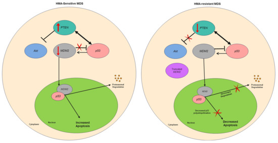 Given the fact that MDM2 expression was downregulated in all four HMA-resistant sublines in this study and that P39 and Kasumi-1 did not harbor chromosome 5q deletion, both the tumor-suppressive role independent of 5q deletion and the conventional proto-oncogenic role of MDM2 observed in del(5q) MDS should be considered [53]. Due to the fact that the functional impact of MDM2 on the common myeloid progenitor or granulocyte monocyte progenitor is unknown, we cannot exclude a potential oncogenic role of MDM2 in cell differentiation and within the bone marrow environment [54]. In the context of cell cycle regulation and apoptosis, we hypothesize that the HMA-resistant cells evade apoptosis not only by PTEN suppression but also by MDM2 downregulation, with both PTEN and MDM2 functioning as tumor suppressors. Taking into account the oncogenic role of MDM2 reported in del(5q) MDS and AML, we further propose a functional switch of MDM2 from oncogenic to tumor suppressive during HMA resistance, with loss of MDM2 being attributed to RNA hypomethylation (Figure 5) [50,51] In addition, the truncated MDM2 observed in our study only retains the 3′ UTR and is in-keeping with a long non-coding RNA without open reading frame [55]. It has been shown that the iron-binding protein IRP2 binds to the 3′UTR of MDM2, which results in stabilization of the MDM2 transcript [56]. We postulate that there is a competitive binding between normal MDM2 and the truncated MDM2 for IRP2, resulting in MDM2 mRNA instability and degradation during HMA resistance. The downregulation of MDM2 was clearly observed on our cell line models despite being not too noticeable in patients. This supports our proposition that MDM2 switched from an oncogene to tumor suppressor gene during treatment with HMA with MDM2 downregulation contributing to HMA resistance.