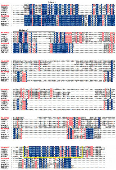 Multiple sequence alignment of MaBBX20, MaBBX51, and other BBXs. The alignment was generated using the GeneDoc software. Blue, pink, and grey columns indicate 100%, 80%, and 60% identity, respectively. The B-box and CCT domains are marked by dark lines and the yellow square, respectively. GeneBank accession numbers for all proteins are listed in Supplementary Table S2.