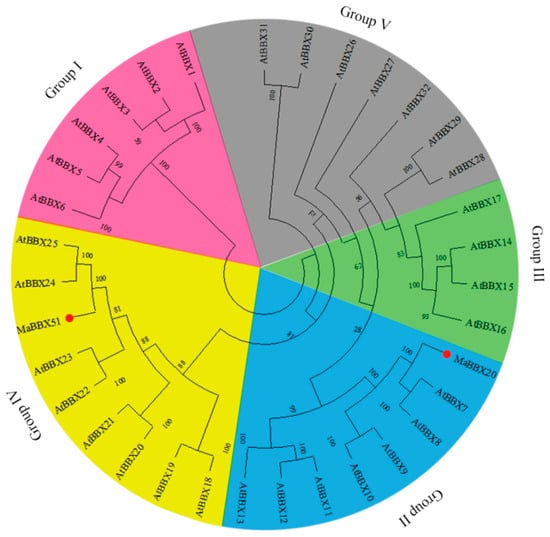 Phylogenetic analysis of MaBBX20, MaBBX51, and 32 A. thaliana BBX transcription factors. The neighbour-joining phylogenetic tree was constructed using the MEGAX software. Numbers next to each branch represent the bootstrap values of 1000 replicates. MaBBX20 and MaBBX51 are marked by red dots. Five subfamilies (I to V) are indicated in pink, blue, green, yellow, and grey. GenBank accession numbers for all proteins are listed in Supplementary Table S2.