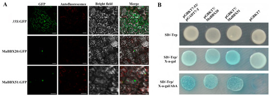 To determine the subcellular localisation of the two MaBBXs, N. benthamiana leaves were separately transfected with 35S:GFP, 35S:MaBBX20:GFP, and 35S:MaBBX51:GFP fusion constructs. As shown in Figure 3A, the green fluorescence signal of the control 35S:GFP was not specifically localised in the nucleus. Whereas that of 35S:MaBBX20:GFP and 35S:MaBBX51:GFP were specifically localised in the nuclei, indicating that MaBBX20 and MaBBX51 are nuclear localised.
