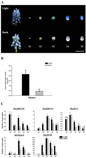 First, we detected differences in the expression of MaBBX51 and MaBBX20 in various tissues (roots, bulbs, leaves, old leaves, and flowers) of M. aucheri ‘Dark Eyes’. The qPCR analysis results showed that MaBBX51 was relatively highly expressed in young leaves, old leaves, and flowers, and that MaBBX20 was relatively highly expressed in old leaves and flowers (Figure S2). To further evaluate whether the expression of the two MaBBX genes is correlated with light-induced anthocyanin accumulation in grape hyacinth, we used aluminium foil to cover the whole inflorescence during the floral developmental stages (S1–S5) of M. aucheri ‘Dark Eyes’. As shown in Figure 4A, the shade condition blocked anthocyanin accumulation in the flowers, resulting in etiolated phenotypes; high-performance liquid chromatography (HPLC) also confirmed that the total anthocyanin levels of the whole inflorescence were significantly reduced, indicating that the flower colouration depends on light exposure (Figure 4B). Moreover, the expression levels of MaBBX20 and MaBBX51 were downregulated to different degrees during S2–S5 after shade treatment, similar to the downregulation of the anthocyanin-related genes MaMybA and MaDFR (Figure 4C). The light-sensitive stage of MaBBX51 was S2, whereas that of MaBBX20 was S3–S5. MaHY5 also showed downregulation after shade treatment during S2–S4, especially in S3. Taken together, the above results indicate that the two MaBBX genes and MaHY5 may be light-induced TFs involved in the regulation of anthocyanin synthesis in grape hyacinth.