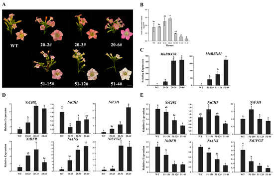 Functional analysis of MaBBX20 and MaBBX51 in the tobacco plant. (A) Flower phenotypes of overexpressing transgenic lines. Three independent transgenic lines were used for each gene. Scale bar: 2 mm. (B) Anthocyanin content in tobacco corollas of transgenic lines. FW, fresh weight. (C) qPCR analysis of MaBBX20 and MaBBX51 expression in the corollas of their transgenic tobacco. (D,E) Relative expression levels of NtCHS, NtCHI, NtF3H, NtDFR, NtANS, and NtUFGT in the corollas of transgenic lines overexpressing MaBBX20 (D) and MaBBX51 (E). 20–2#, 20–3#, and 20–6# were transgenic lines of MaBBX20; 51–4#, 51–12#, and 51–15# were transgenic lines of MaBBX51. NtTubA1 was used as an internal control. Data are presented as the mean ± SD. Different letters above the bars indicate significantly different values calculated using one-way ANOVA followed by LSD analysis (p < 0.05).