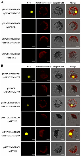 For BiFC assays, MaBBX51, MaBBX20, MaHY5, and MaMybA without termination codons were recombined into the pSPYCE (M) vector, whereas those with termination codons were recombined into the pSPYNE (R)173 vector [44,45]; the primers used are listed in Supplementary Table S1. The recombinant and/or empty vectors were transformed into A. thaliana mesophyll protoplasts using polyethylene glycol [57]. After transformation for 20 h, the YFP signal was imaged using the TCS SP8 confocal laser microscope.