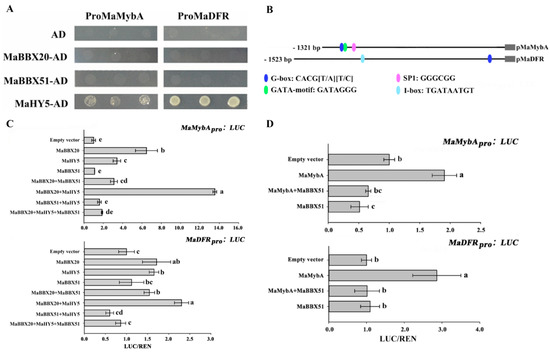 MaBBX20 and MaBBX51, together with MaHY5, coordinate anthocyanin biosynthesis regulation by activating the transcription of MaMybA and MaDFR. (A) Yeast one-hybrid assays of MaBBX20, MaBBX51, MaHY5, and the promoters of MaMybA and MaDFR. MaBBX20 and MaBBX51 did not bind to the promoter regions of either MaMybA or MaDFR, whereas MaHY5 did. (B) Distribution of light-responsive elements in the promoters of MaMybA and MaDFR. (C,D) Luciferase/Renilla (LUC/REN) activity ratio to determine the effects of MaBBX20, MaBBX51, and MaHY5 (C) MaMybA and MaBBX51 (D) on the expression of MaMybA or MaDFR in N. benthamiana leaves. Data are presented as the mean ± SD. Different letters above the bars indicate significantly different values calculated using one-way ANOVA followed by LSD analysis (p < 0.05).