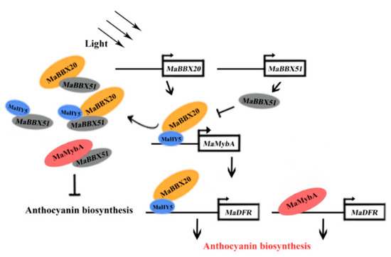 Suggested model for the roles of MaBBX20 and MaBBX51 in light-induced anthocyanin biosynthesis in grape hyacinth. Light activates MaBBX20, MaBBX51, and MaHY5 expression. MaBBX20 then interacts with MaHY5 and forms a MaBBX20–MaHY5 complex to activate MaMybA and MaDFR transcription, thereby positively regulating anthocyanin biosynthesis. Conversely, MaBBX51 interacts with MaHY5 and MaBBX20, hampering the formation of the MaBBX20–MaHY5 complex and subsequently inhibiting MaMybA and MaDFR transcription. MaBBX51 can also interact with MaMybA, inhibiting its binding to its promoter or that of MaDFR, thereby negatively regulating anthocyanin biosynthesis.