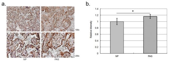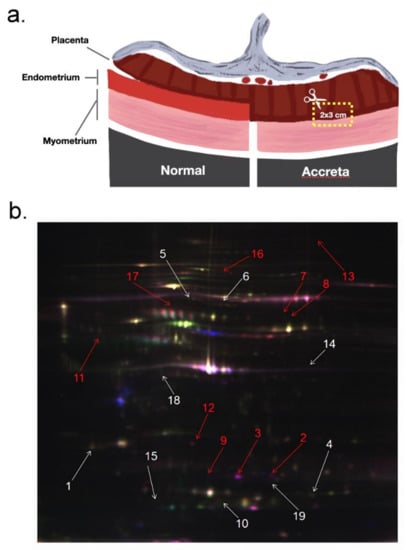 - Bartels, H.C.; Postle, J.D.; Downey, P.; Brennan, D.J. Placenta Accreta Spectrum: A Review of Pathology, Molecular Biology, and Biomarkers. Dis. Markers 2018, 2018, 1507674. [Google Scholar] [CrossRef]