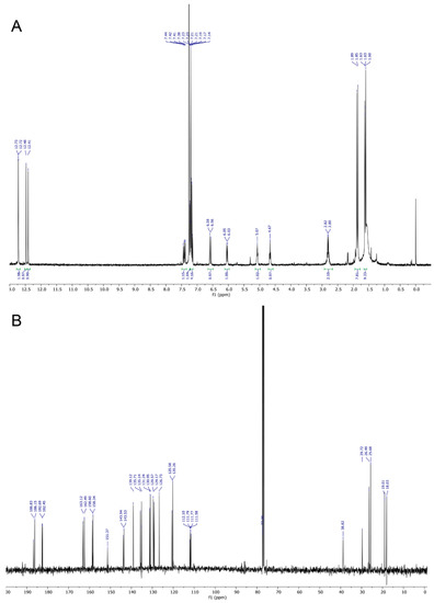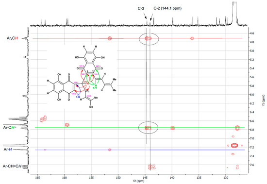The 1H and 13C NMR spectra of SK119 in CDCl3 (Figure 2A,B, NMR data: Table 1) reveal a dimeric structure of SK119. Hence, the 13C NMR spectrum showed the nearly 30 signals, including four carbonyl signals (δ = 182 to 187 ppm). The 1H NMR spectrum (Figure 2A) shows two shikonin-like moieties, A and B, as exemplified by the four singlets of phenolic OH protons (δ = 12.4 to 12.7 ppm) and the four singlets of the four methyl groups (δ = 1.6 to 1.9 ppm), but only one methylene group (multiplet at δ = 2.8 ppm). Two doublets at δ = 6.04 and 6.58 ppm resp. and a doublet of doublets at δ = 7.41 ppm with coupling constants of 15.6 and 11.3 Hz indicate the elimination of water in one side chain, resulting in an (E)-4-methylpenta-1,3-dienyl group in the shikonin-like moiety A. There is still a 4-methylpent-3-enyl group attached to the shikonin-like moiety B, but the α-hydroxy group is replaced by a less polar substituent. DEPT-HSQC and 1H,1H COSY (see Supplementary Materials, Figures S1 and S2) show the signals of the α-CH (CH-11′) at δ = 4.67 ppm and δ = 38.8 ppm. DEPT-HSQC and HMBC (see Supplementary Materials, Figures S2 and S3) allowed to assign all of the hydrogen and carbon atoms of subunit B, which still bears a hydrogen in position 3. Overlay and very similar chemical shifts of several signals prevent the distinct assignment of all signals of entity A, but couplings of α-CH of the 4-methylpent-3-enyl chain (CH-11′) with carbonyls of both quinones confirm this CH group as a linker of both quinones. In HMBC, the carbon signal at 143.8 ppm, which belongs to naphthazarine A, couples with α-protons of both of the side chains, whereas the two α-protons couple to different carbonyls of moiety A. This, as well as the NOEs (see Supplementary Materials, Figure S4) between the two α-CH of the side chains (H-11 and H-11′), prove the proximity of both chains. The C-2 of moiety A is assumed to show cross peaks in HMBC with α and β protons of the 4-methylpenta-1,3-dienyl group, but probably due to overlay with signals of C-3 or δ-C (C-14), the signal of C-2 could not be identified. Therefore, SK119 was also measured in benzene-d6 (see Supplementary Materials, Figures S5–S8). As depicted in Figure 3, C-2 appears as an additional signal at 144.1 ppm close to C-3 (144.7 ppm) coupling with the α protons of both side chains.