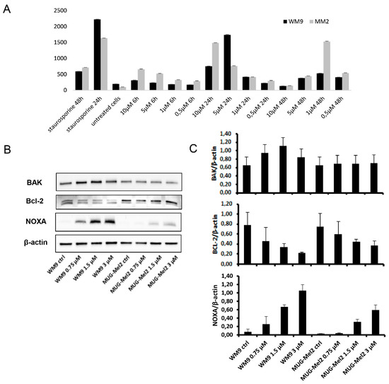 Figure 4. Apoptotic induction by treatment with SK119. (A) Results of the Caspase-Glo® 3/7Assay. Treatment of WM9 and MUG-Mel2 cells led to a strong activity increase in caspases 3/7, indicative of apoptosis induction 24 h after treatment (mean ± SD, n = 6). Staurosporine (25 µM) served as positive control; (B) Western blot analyses were used to verify the expression of the pro-apoptotic BAK, the anti-apoptotic Bcl-2 and the antagonist NOXA at the protein level. One representative blot out of three is shown and β-actin was used as loading control; (C) Densiometric quantification are presented (mean ± SD; n = 3). All full-length blots are presented in the Supplementary Materials, Figure S12.