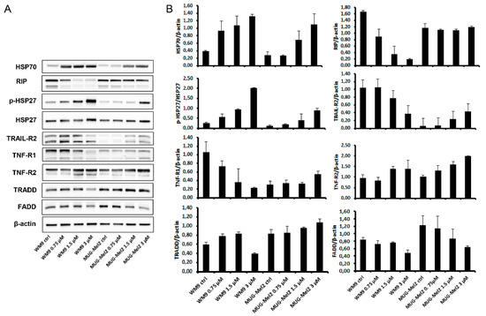 Figure 5. Influence of SK119 treatment on protein expression of death receptors. (A) Protein expression analysis of the heat shock proteins HSP27 and HSP90, the tumor necrosis factor (TNF) receptor TNF-R1 and TNF-R2, TRAIL-R2, and the adaptor proteins FADD, TRADD, and RIP after treatment with 0.75 µM and 1.5 µM SK119 for 24 h in WM9 and MUG-Mel2 cells. Untreated control cells (ctrl) served as reference value and β-actin was used as loading control. One representative blot out of three is shown; (B) Densiometric quantifications are presented (mean ± SD; n = 3). All full-length blots are presented in the Supplementary Materials, Figure S13.
