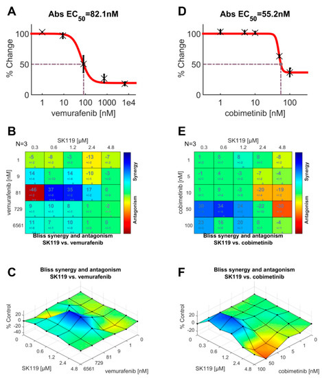 Figure 6. Treatment of WM9 and MUG-Mel2 cells with vemurafenib or cobimetinib and SK119. (A–C) treatment of WM9 cells with vemurafenib (A) or vemurafenib and SK119 in varying concentrations and analyzed using the Bliss model and the Combenefit software tool (B,C); (DF) treatment of MUG-Mel2 cells with cobimetinib (D) or cobimetinib and SK119 in varying concentrations and analyzed using the Bliss model and the Combenefit software tool (E,F) (n = 3, incubation time: 72 h).
