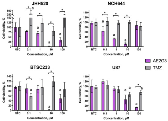 Evaluation of viability of cells of different glioblastoma cell lines (GSCs—JHH520, NCH644, BTSC233 and non-GSCs—U87) after 72 h of treatment by AE2G3 in comparison with standard-care treatment by temozolomide (TMZ). Asterisk (*) marks the significant difference (p < 0.05) between columns, letter “a” marks significant difference in comparison with non-treated control (NTC).