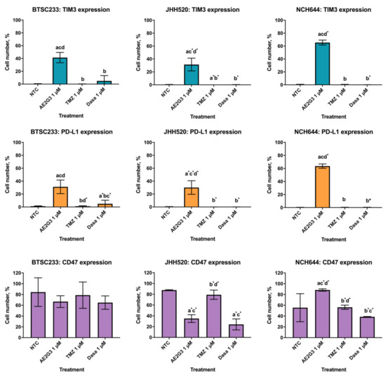 Evaluation of expression of surface markers (TIM3, PD-L1, CD47) on cells of GSCs cell cultures after treatment of cationic phosphorus dendrimer AE2G3 in comparison with non-treated control (NTC), temozolomide (TMZ) and dasatinib (Dasa). “a” marks significant difference in comparison with NTC, “b” marks significant difference from AE2G3 treatment, “c” marks significant difference with TMZ treatment and the letter “d” marks a significant difference in comparison with Dasa (p < 0.05). Letters with an asterisk * mark the tendency (0.08 < p < 0.05).