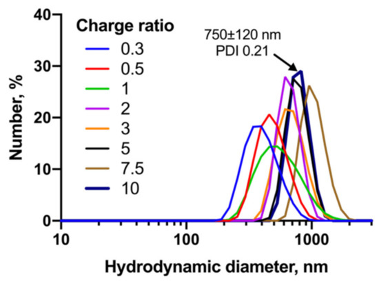 Dynamic light scattering profiles of AE2G3/siLyn dendriplexes obtained at different charge ratio (indicated on graph). Bold line represents the ratio used for further work, and the parameters of this complex are given on the graph.