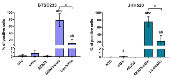 Evaluation of internalization of AE2G3 complexes with fluorescent-labelled RNA (siGlo) into glioblastoma stem-like cells BTSC233 and JHH 520 after 4 h of treatment in comparison with Lipofectamine 3000 (Lipo) complexes. Letters mark significant differences (p < 0.05): “a”—vs. NTC, “b”—vs. siGlo, “c”—in vs. free AE2G3. Bars with asterisks (*) show significant differences between two variants of complexes.