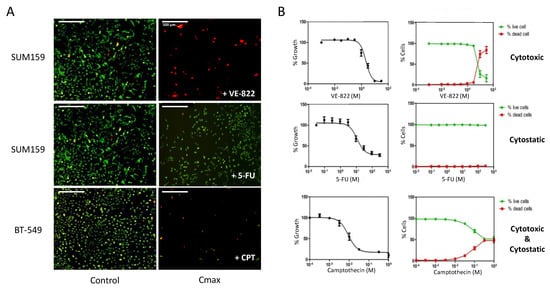 The image analyses allowed us to calculate the percentages of dead and live cells per well that were plotted as a function of the drug concentrations (Figure 1B, right panel). We also calculated the percentages of growth inhibition based on the total number of cells (live + dead) in each well, compared with untreated controls. We plotted these percentages as a function of the drug concentrations to calculate the IC50 values (drug concentration that inhibits 50% of cell growth) (Figure 1B, left panel). The results of Figure 1B illustrate the three main categories of effects that can be observed: drugs that are mainly cytotoxic, such as VE-822 in SUM159 cells; drugs that are primarily cytostatic, such as 5-FU in SUM159 cells; and drugs with both cytostatic and cytotoxic effects, such as camptothecin in BT-549 cells.