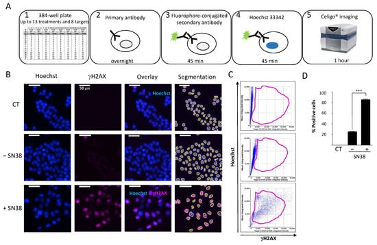 (A) Celigo® imaging strategy used for DDR evaluation. (B) Representative fluorescence images of H2AX phosphorylation in HCT116 cells incubated (+) or not (−) with SN38 (2 µM, 24 h). Hoechst was used for nuclear staining and total cell count using the dedicated segmentation protocol (right panels). Images were acquired and analyzed using the Target + Mask application. CT: control cells stained only with the secondary antibody. (C) Representative flow-like analyses of the images obtained in (B). The dot plots show the Hoechst integrated intensity as a function of γH2AX integrated intensity. A gate (in purple) was defined for the control condition (CT) and applied to all other conditions to determine the percentage of positive cells and the fluorescence intensity in each cell. (D) Percentages of fluorescent positive cells for γH2AX labeling plotted in function of the cell treatment. The bar graphs represent the quantitative data (mean ± SD; n = 3) of the fluorescent images from one representative experiment; *** p < 0.0001 (Student’s t-test).