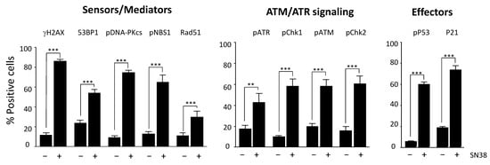 Monitoring of the HCT116 cell response to SN38 using a panel of DDR markers. Cells were incubated with 2 µM SN38 for 24h, and immunofluorescence staining was performed with antibodies against γH2AX, 53BP1, phosphorylated (p) NBS1, RAD51, pDNA-PKcs, pATR, pCHK1, pATM, pCHK2, pP53, and P21, as indicated in Materials and Methods. Fluorescent positive cells were quantified for each DDR marker in untreated cells and in cells incubated with SN38. Results are the mean ± SEM of ≥ 3 independent experiments; ** p < 0.01 and *** p < 0.001 (Student’s t-test).