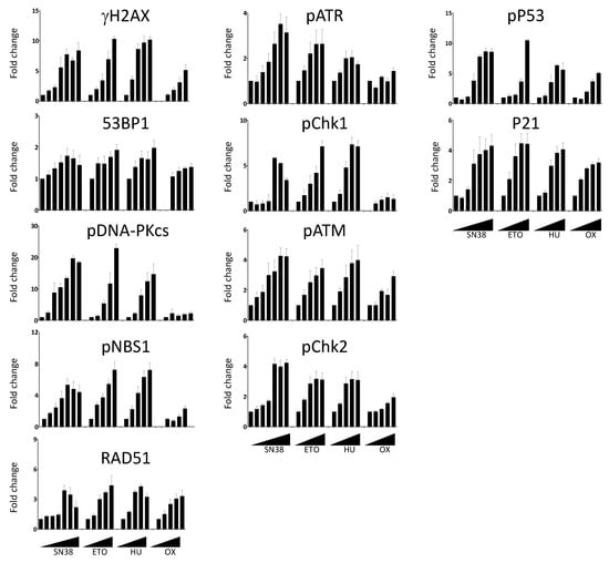 We then extended our study to an additional panel of eleven DDR markers based on their reported key role in DNA damage signaling and/or repair: H2AX, DNA-PKcs, ATR, ATM, CHK1, CHK2, 53BP1, NBS1, RAD51, P53, and P21. Most of them are phosphorylated following DNA damage.