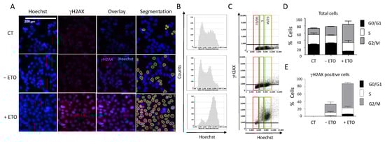 DDR response and cell cycle analyses. (A) HCT116 cells were incubated with 100 µM etoposide for 20 h. Cells were then fixed and stained for DNA with Hoechst and for γH2AX, and plates were analyzed using the Celigo® system, as described in Figure 3. Representative fluorescence images are shown for each condition. Hoechst staining was used for segmentation and to quantify the DNA content in each cell. (B) Cell cycle profiles showing the total cell distribution in function of their DNA content, evaluated by the Celigo® flow cytometry interface. (C) Distribution of γH2AX-positive cells in function of their cell cycle phase, determined by the segmentation process according to the following color code: red = G0/G1, green = S, brown = G2/M. (D,E) Quantitation of the results shown in (B,C), respectively. Three independent experiments were performed. Results are the mean ± SD of a technical triplicate from one representative experiment. CT: untreated cells stained only with the secondary antibody.
