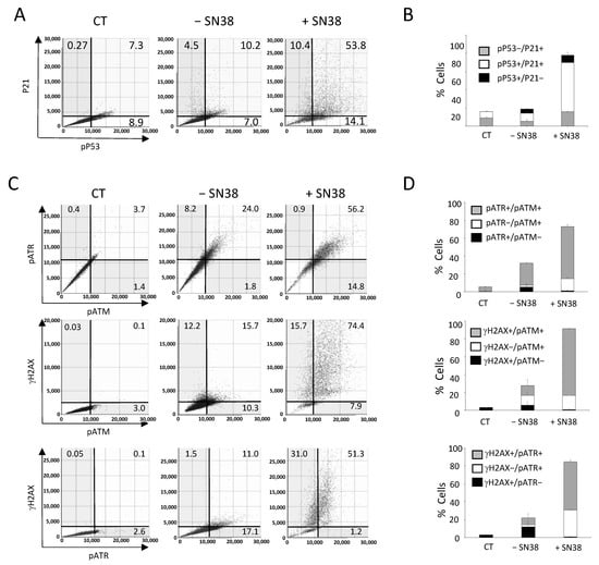 Multiplexed analyses of DDR markers following DNA damage. HCT116 cells were incubated with SN38 (2 µM) for 20 h. Then, multiplexed immunofluorescence labeling with anti-phosphorylated (p) ATM, -pATR, -γH2AX or -pP53 and -P21 antibodies was performed and analyzed with the Celigo® flow cytometry interface using a gating that was determined for the CT condition (untreated cells stained only with the secondary antibody). (A,C) Representative dot plots show the distribution of fluorescent cells in function of their DDR marker status. (B,D) Quantitation of the results shown in (A,C). Independent experiments were performed twice for pATM/pATR/γH2AX labeling, and three times for P21/pP53 labeling. Results are the mean ± SD of a technical triplicate from one representative experiment.