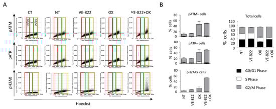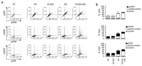 We also performed multiplexed analyses using the antibody combination against γH2AX/pATM/pATR according to the experimental conditions described earlier (Figure 7 and Figure 8). The percentage of cells positive for γH2AX, pATM, and pATR was increased following incubation with oxaliplatin compared with untreated cells: 19% vs. 1.9%, 46% vs. 10%, and 55% vs. 26%, respectively (Figure 7B and Figure 8B). As expected, the addition of VE-822 to oxaliplatin led to a drastic increase in the percentage of γH2AX-fluorescent cells to 55%, in accordance with the synergistic effect of the combination (Figure 7B and Figure 8B). Conversely, VOX did not significantly change the percentages of cells labeled for pATM and pATR. Our multiplexed analyses also revealed that most HCT116 cells positive for pATR and pATM were also positive for γH2AX (Figure 7).
