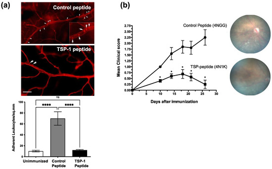 Unimmunized and IRBP-immunized mice (day 9 post-immunization) treated with either control or 4N1K peptide were anesthetized and perfused with 10 mL of PBS to remove intravascular content, including non-adherent leukocytes. Perfusion with 10 mL of Rhodamine-conjugated Concanavalin A (ConA, 5 µg/mL in PBS pH 7.4) (Vector labs, Burlingame, CA, USA) was performed to label adherent leukocytes and vascular endothelial cells. Residual unbound lectin was removed by perfusing an additional 10 mL of PBS. The carefully harvested retinas were flat mounted in a mounting medium (Vector labs). Each retina was imaged with fluorescence microscope (Olympus FSX100, Tokyo, Japan), and the adherent leukocytes per retina were counted. Similar assessments were performed on wild-type and TSP-1-deficient mice 24 h after injecting 100 µg of LPS from Salmonella typhimurium (Sigma Chemical, St. Louis, MO, USA) in one hind footpad.