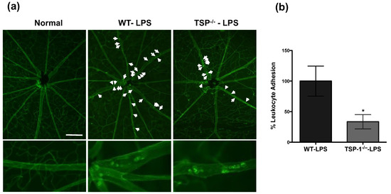 In contrast to our results in this study, a previous in vitro study reported that endogenous TSP-1 and its interaction with its receptor CD47 mediates increased expression of VCAM-1 in TNF-α-stimulated vascular endothelial cells [3]. We first sought to determine whether the apparent contradiction in our observation resulted from our in vivo approach. To address this issue, we used endotoxin-induced uveitis (EIU) model of acute ocular inflammation induced by administering lipopolysaccharide (LPS). In this model, TNF-α-mediated leukocyte adhesion in retinal vessels contributes to the pathogenesis [22,23]. We induced EIU in WT and TSP-1-deficient mice and evaluated leukocyte adhesion in retinal whole mounts 24 h after intraperitoneal (i.p) injection of LPS. As shown in Figure 2a, while increased numbers of adherent leukocytes were detected in LPS-injected WT retinas, very few leukocytes were detected in retinas from LPS-injected TSP-1-deficient mice. Quantitative assessment of adherent leukocytes indicated a significant reduction in leukocyte adhesion in TSP-1-deficient mice compared to WT mice (Figure 2b). These results support a possibility of TSP-1-mediated leukocyte adhesion during acute inflammation and are consistent with previously reported endothelial response to TNF-α. Thus, our in vivo studies reveal an opposing role of TSP-1 in acute and chronic inflammation.