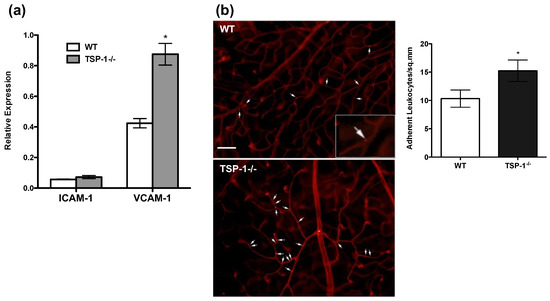 The expression of VCAM-1 and adherence of leukocytes is increased in TSP-1-deficient blood vessels in the retina. (a) Real-time PCR was performed on RNA isolated from retinas harvested from WT or TSP-1-deficient (TSP-1−/−) mice (8 weeks old, n = 5 each group) to detect message levels for ICAM-1 and VCAM-1 genes. Results are expressed as the mean ± SEM. (b) Firmly adherent leukocytes in retinal vessels were visualized by perfusing mice with rhodamine-conjugated Con A (red) before harvesting retina. Representative images of retina whole mounts from WT and TSP-1-deficient mice are shown with a quantitative assessment of adherent leukocytes in retinal vessels (n = 4 each group). White arrows indicate adherent leukocytes in the main images, and the inset shows a digital magnification of an area. Data are expressed as the mean number of leukocytes per mm2 ± SEM. * p < 0.05. Scale bar = 75 µM.