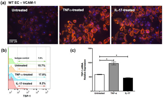 Considering that IL-17 was demonstrated to play a dominant role in IRBP-induced model of chronic uveitis [24], next, we confirmed that the expression of VCAM-1 on primary mouse vascular endothelial cells is induced by IL-17, as previously reported in human vascular endothelial cells (HUVEC) [13]. Similar to TNF-α, IL-17 induced VCAM-1 expression in mouse vascular endothelial cells cultured in the presence of TNF-α or IL-17 (10 ng/mL) (Figure 4a). We then compared the endogenous expression of TSP-1 in untreated, TNF-α- and IL-17-treated mouse endothelial cells. The mean fluorescence intensity of TSP-1 staining determined using ImageJ analysis indicated significantly reduced staining in IL-17-treated cells compared to TNF-α-treated cells (15.5 ± 2.8 vs. 26.3 ± 4.5, respectively, p < 0.05, n = 16). Quantitative analysis by flow cytometry consistently revealed increased proportion of cells stained positively for intracellular TSP-1 after TNF-α treatment as compared to untreated cells (Figure 4b). However, IL-17 treatment of endothelial cells resulted in nearly 50% reduction in the number of TSP-1-positive cells. This observation was confirmed by significantly increased TSP-1 message levels in TNF-α and reduced levels in IL-17-treated cells compared to untreated cells (Figure 4c). Together, these results suggest that unlike TNF-α, IL-17-mediated VCAM-1 expression in vascular endothelial cells may not be mediated by their endogenous expression of TSP-1.