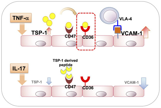 The expression of vascular cell adhesion molecule (VCAM)-1 in activated endothelial cells plays a significant role in adhesion of lymphocytes, monocytes, as well as neutrophils [1]. Such expression of VCAM-1 represents a downstream effect of pro-inflammatory cytokines that facilitates recruitment of leukocytes at the site of inflammation. Therefore, in addition to blocking cytokines such as TNF-α and IL-17, blockade of VCAM-1 ligand has also emerged as a successful therapeutic approach for autoimmune diseases [2]. Vascular endothelial cells are reported to respond to TNF-α by increasing their endogenous expression of TSP-1 to mediate increased expression of VCAM-1 through signals delivered via its receptor CD47 [3]. These results are considered consistent with a pro-inflammatory role of TSP-1, as concluded in several models of acute inflammation [4,5,6,7]. However, these studies fail to explain the observed spontaneous development of chronic autoimmune disease in TSP-1-deficient mice [8]. Clinical symptoms of this chronic pathology are improved, not only in response to VCAM-1 blockade [9], but also in response to CD47-binding agonist peptide derived from TSP-1 [10]. In fact, these reports support an anti-inflammatory role of TSP-1. The contrasting outcome of TSP1:CD47 interaction in acute vs. chronic inflammatory conditions suggests the existence of differential mechanisms mediated by TSP-1 under these conditions.