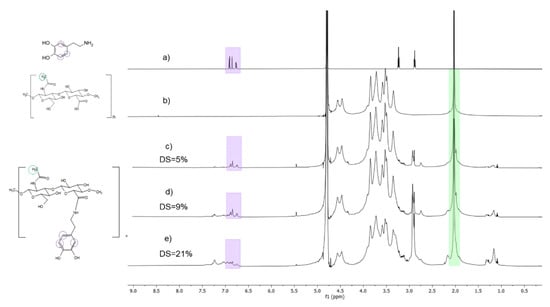 1H-NMR spectra of (a) dopamine, (b) hyaluronic acid (HA), (c–e) HA-dop with different DS (acetyl peak outlined in green, dopamine in purple).