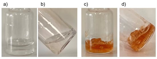 Macroscopic images of (a,b) HA-Dop, DS 5% before adding NaIO4. (c,d) HA-Dop, DS 5% 1 min after adding NaIO4.