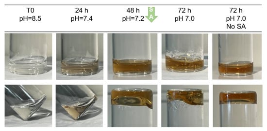 Macroscopic images showing the progressive change of color of HA-Dop (DS 5%) after basification with NaOH. At 48 h, the crosslinking was quenched by the addition of SA, and 24 h later, the gel color remained unchanged. The gel without addition of SA slightly intensified and reddened, suggesting that SA was effective to quench the crosslinking reaction.