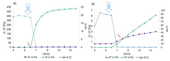 Rheological characterization of the initial crosslinking kinetics of HA-Dop (DS 9%) by NaIO4 (a) and by NaOH (b) in oscillation mode with a constant frequency of 1 Hz. The cross-linker was added at 5.5 min after the start of the measurement. Red arrows indicate gelation points (crossing of G′ with G′ and decrease of tan δ to below 1).