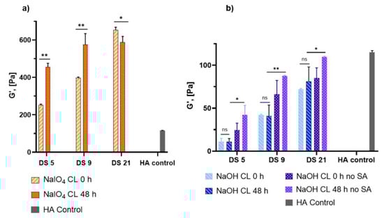 Evolution of the storage modulus (G′) of the NaIO4-CL and NaOH-CL gels at 0 and 48 h after crosslinking initiation (oscillation at 1 Hz). (a): G′ of NaIO4-crosslinked gels at the 3 DS. (b): G′ of NaOH-crosslinked gels with and without addition of SA. Control HA (Belotero Intense®) is given as a reference. * p ≤ 0.01; ** p ≤ 0.0001; ns: not significant.