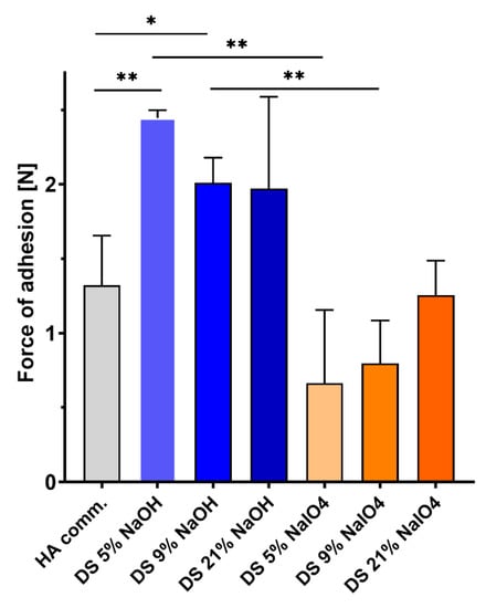 To the best of our knowledge, no reports have evaluated the bioadhesion of HA-Dop crosslinked only by NaOH to the vascular tissues. The data presented in Figure 6 demonstrates that all the NaOH-CL gels had better adhesion to the aorta tissues than the control HA soon after application to the tissues. They were also more adhesive than their NaIO4 crosslinked counterparts, although in the case of the gel with DS 21% this effect was not statistically significant. A long-term adhesion assay could provide more insights into the dopamine-tissue interactions, although maintaining viable ex vivo tissue on the long-term is challenging.