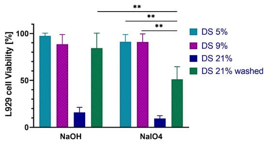 The results of L929 mouse fibroblasts viability after incubation with the gel extracts are presented in Figure 7. The gels with DS 5% and 9% were not toxic when crosslinked with either method, while both methods have caused toxicity of the DS 21% gels. An extensive washing step (48 h, 6 × media changes) helped to reduce the toxicity of the DS 21% NaOH-CL, while the NaIO4-CL DS 21% gel remained toxic even after washings.