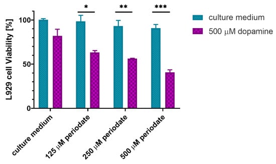 L929 cell viability after 24 h incubation with combinations of dopamine and sodium periodate. n = 3, error bars = SD. * p = 0.03, ** p = 0.003, *** p < 0.0001.