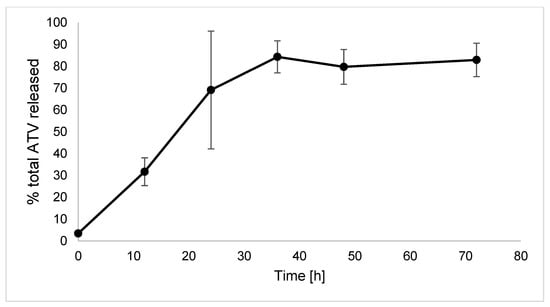 Figure 9 presents the ATV release kinetic from the HA-Dop NaOH-CL gel. Approximately 80% of the total drug (5 mg) is released by 36 h, after which the curve reaches a plateau. The analysis of the drug remaining in the gel after 72 h has shown 22.64% ± 4.01% of the total ATV.