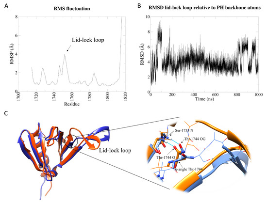 Molecular dynamics simulations were then performed for a total of 1 μs each on the wt and the K1750Δ isolated PH domain in order to evaluate the effect of K1750 deletion in the lid-lock protrusion (alias lid-lock loop) on the intrinsic motions of the isolated PH domain at 300 K.