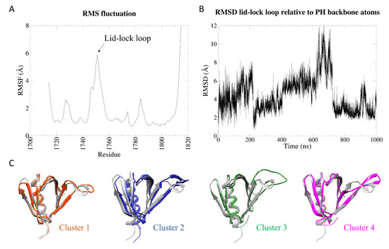 Analysis of the K1750Δ isolated PH domain MD simulation. (A) Root-mean-square fluctuation (RMSF) of backbone atoms of the PH domain. (B) Root-mean-square deviation (RMSD) of the backbone atoms of the lid-lock loop after superposition of the entire PH domain backbone atoms. (C) Centroids of the first four clusters (colored) were aligned against the crystal structure (grey). Cluster 1 and cluster 4 resemble state 1 and state 2 of the wt and the left-right swing due to conformational change in the beta strand before the loop. Cluster 2 and cluster 3 show the “up motion” of the loop, with the flip in the bending orientation (cluster 3) that could not be observed in the wt.