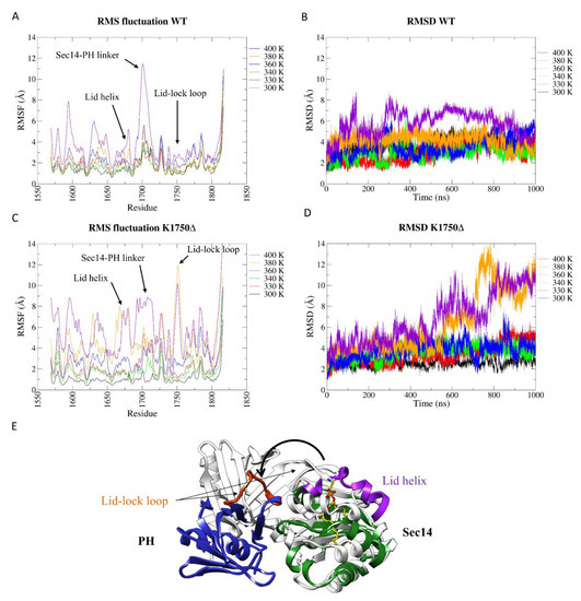 Analysis of MD simulations at increasing temperatures. (A) Root-mean-square fluctuation (RMSF) and (B) root-mean-square deviation (RMSD) of wt Sec14-PH domain. (C) Root-mean-square fluctuation (RMSF) and (D) root-mean-square deviation (RMSD) of K1750Δ mutant Sec14-PH domain. (E) A representative frame from the 380 K simulation of the mutant Sec14-PH domain. The lid-lock loop lost its secondary structure, and consequently, the PH portion detached from the Sec14 moiety.